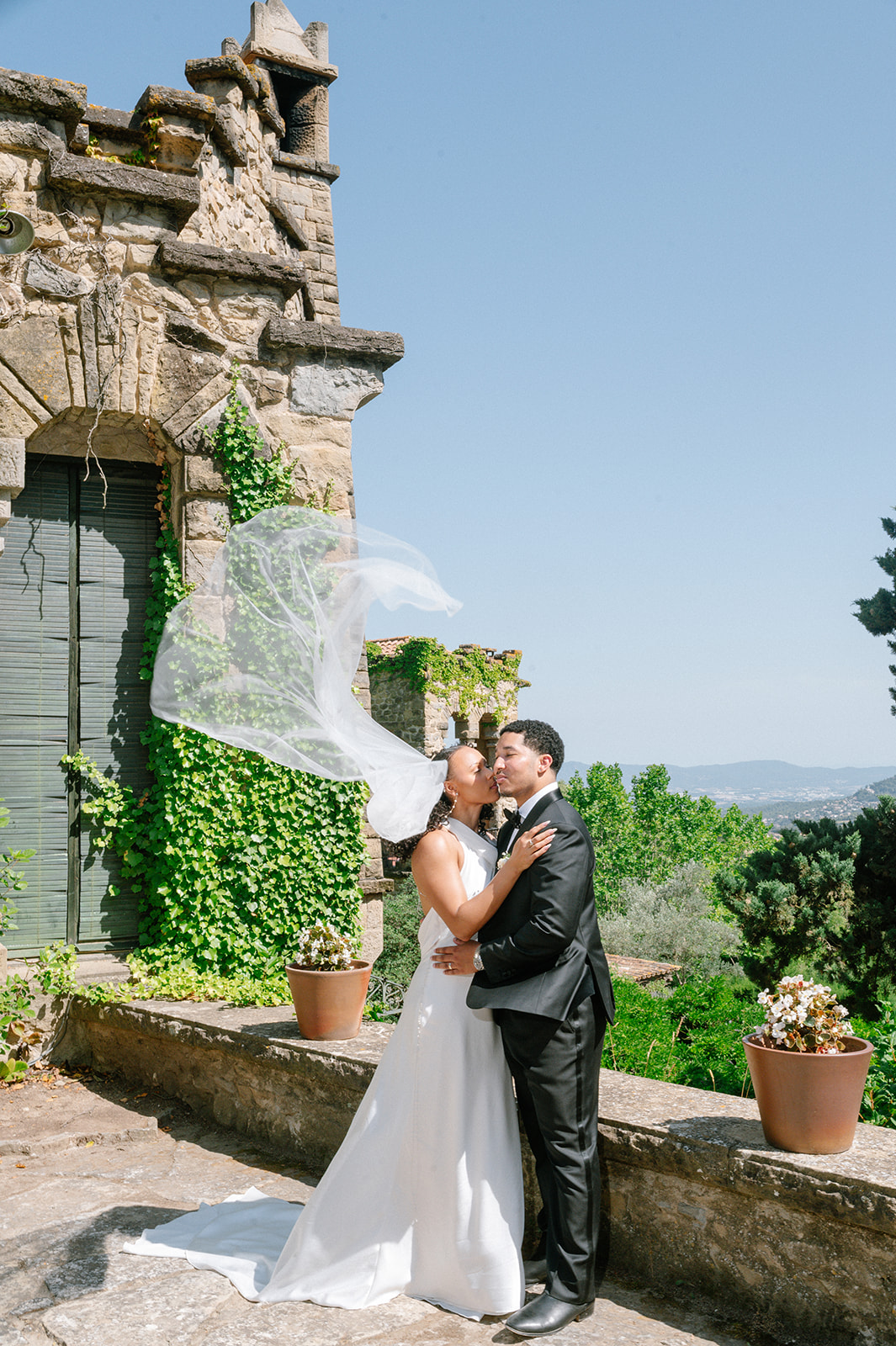 La Baronia offers everything a couple could dream of: stunning architecture that blends traditional Spanish elements with contemporary elegance, breathtaking views, and an atmosphere that feels both intimate and grand. For this stylish couple, it provided the perfect setting for their afternoon portraits and ceremony moments.
